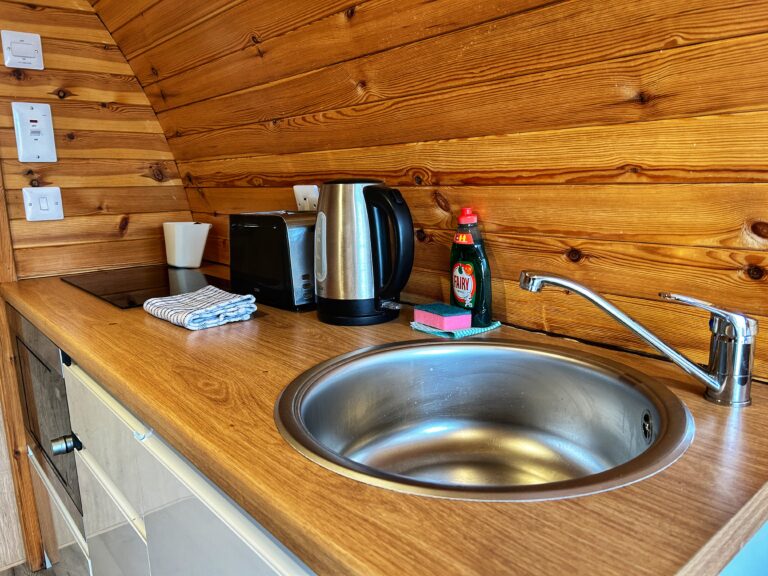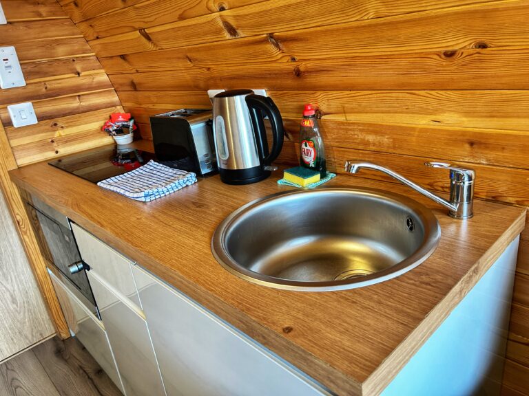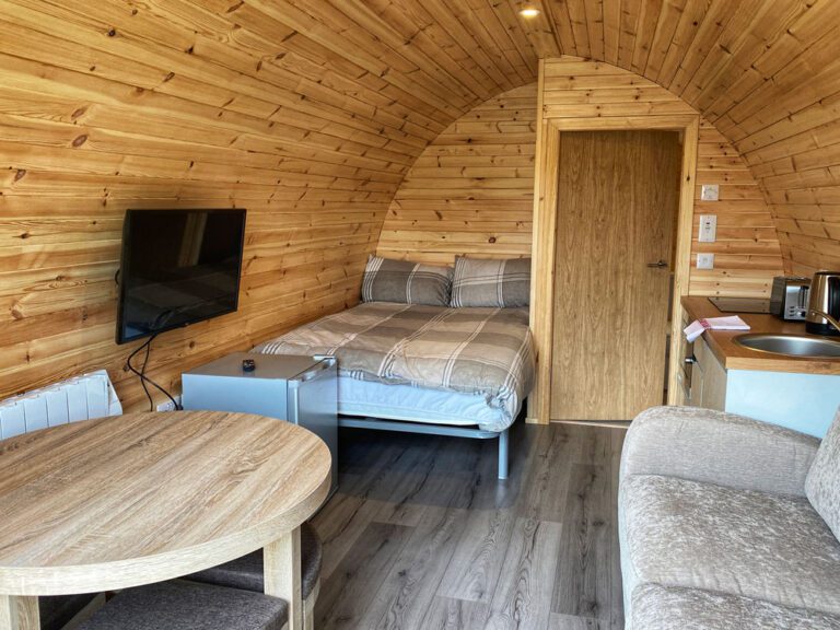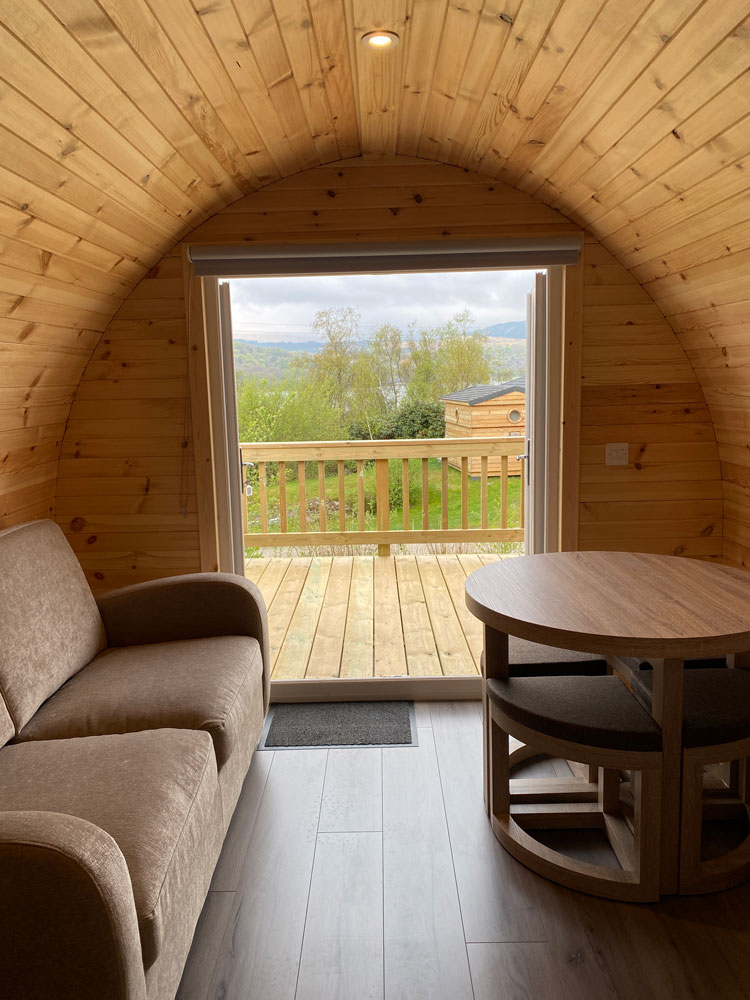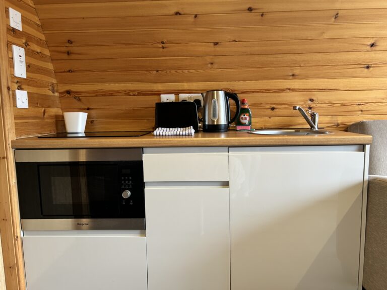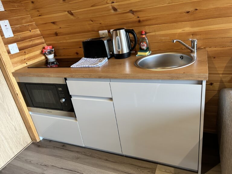 Rowan, Holly, Elm, Juniper, Aspen and Hazel sleep up to two people in their double bed and bed settee. In addition to their own ensuite shower room and seating area, our deluxe pods have a small kitchen area with cooker, microwave and sink to prepare and cook meals.